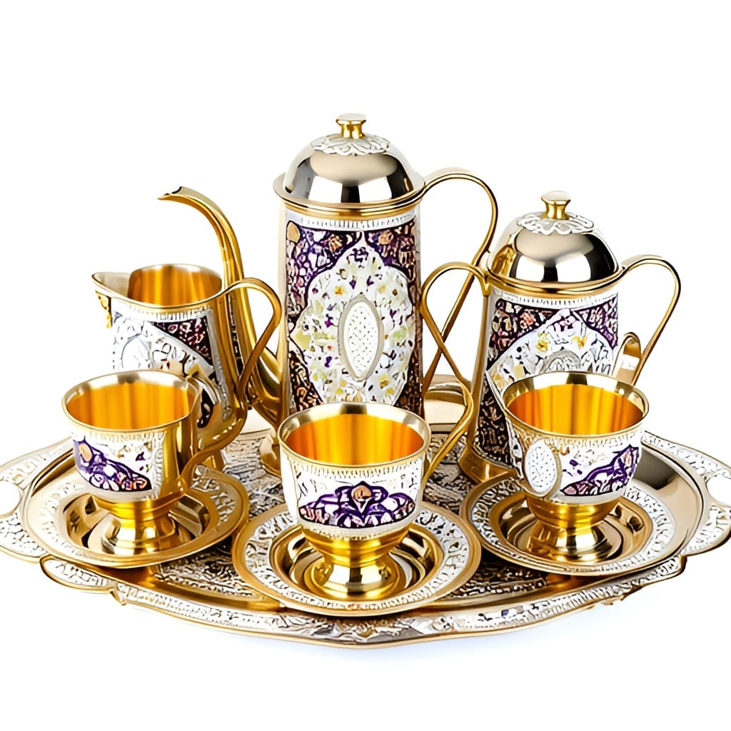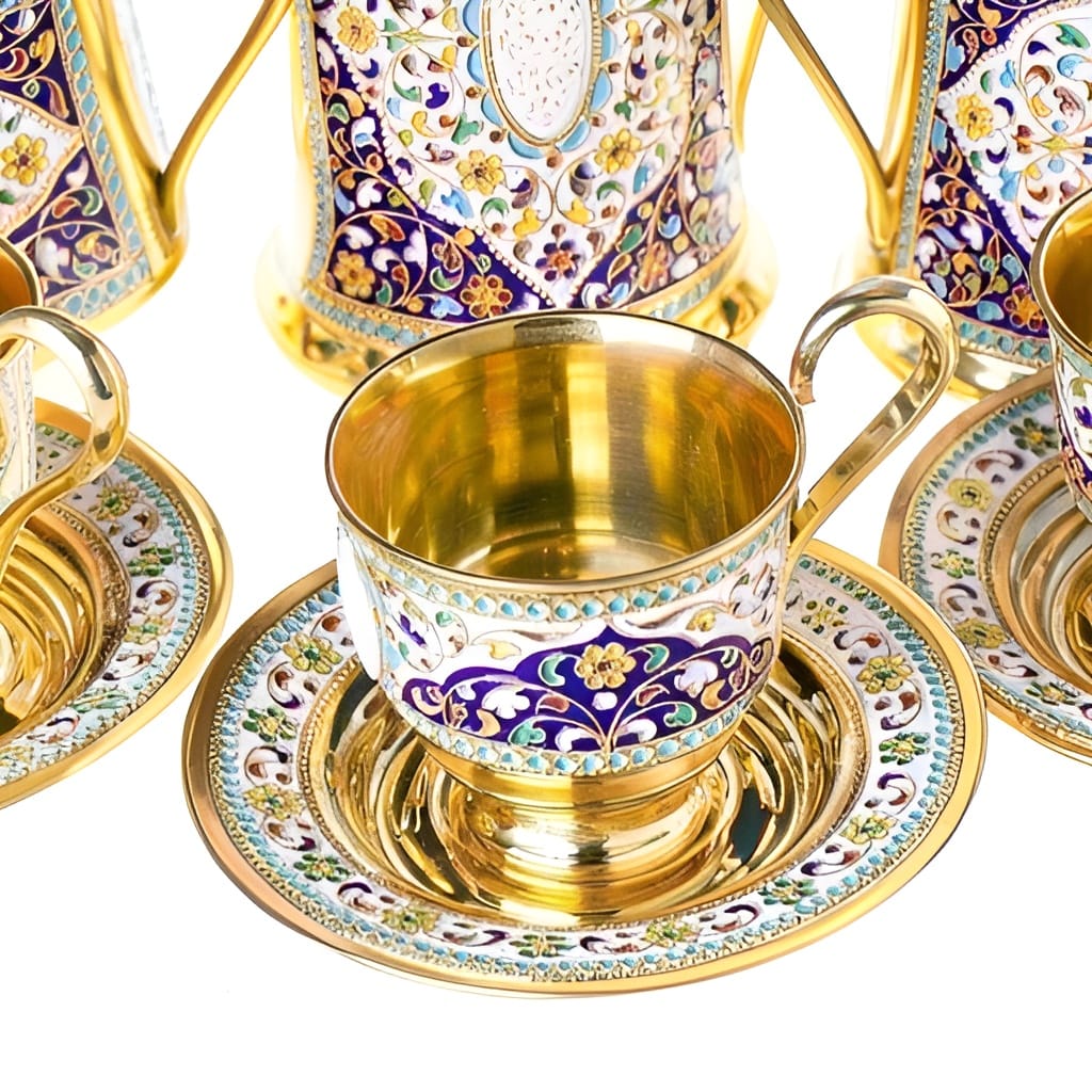 - Ручная филигрань: Тончайшие серебряные узоры, сплетенные вручную, делают каждую деталь сервиза уникальной.