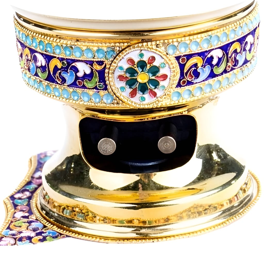 Сочетание золочения, эмали и слоновой кости превращает самовар в настоящий ювелирный объект, а не просто в предмет посуды.