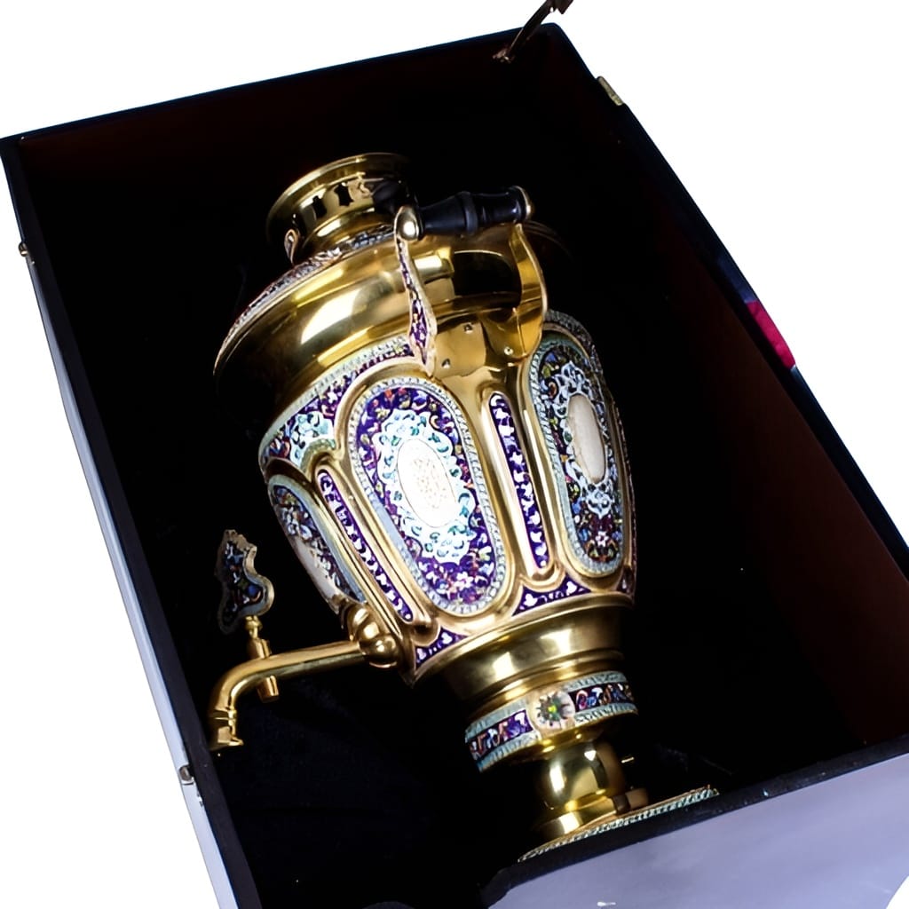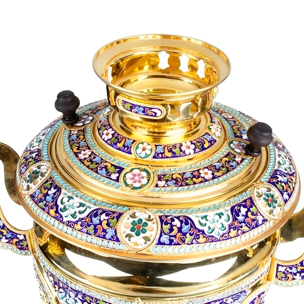 Впечатляющий объём, богатая отделка, позолота и сложная работа с перегородчатой эмалью делают этот самовар центром чайной церемонии и украшением интерьера.