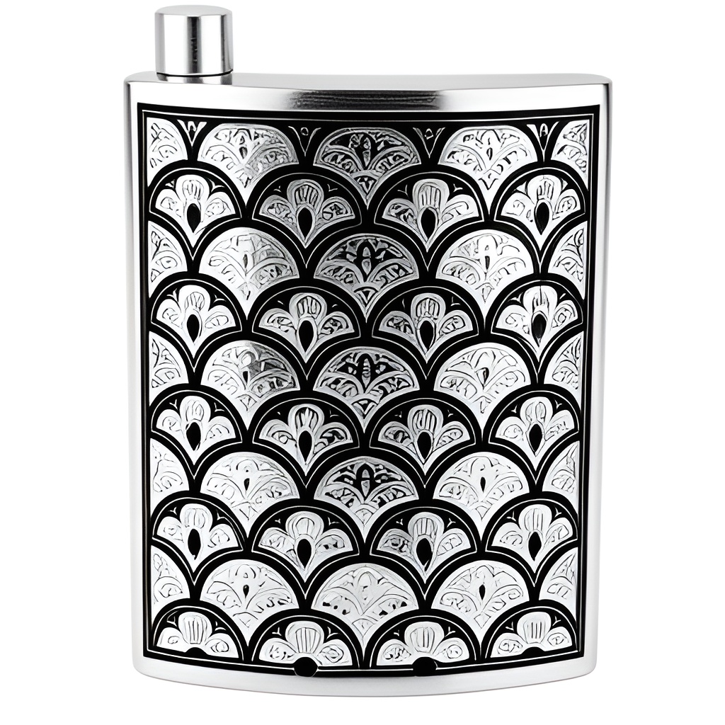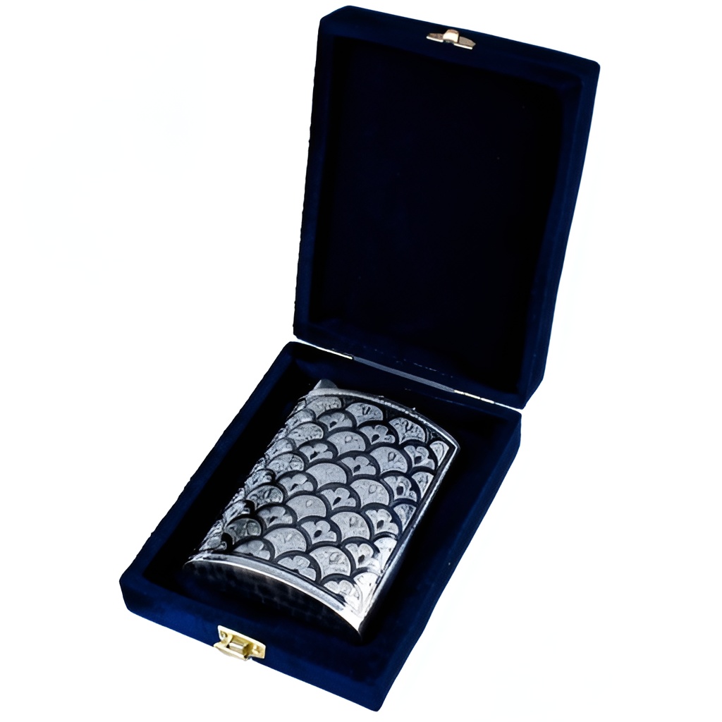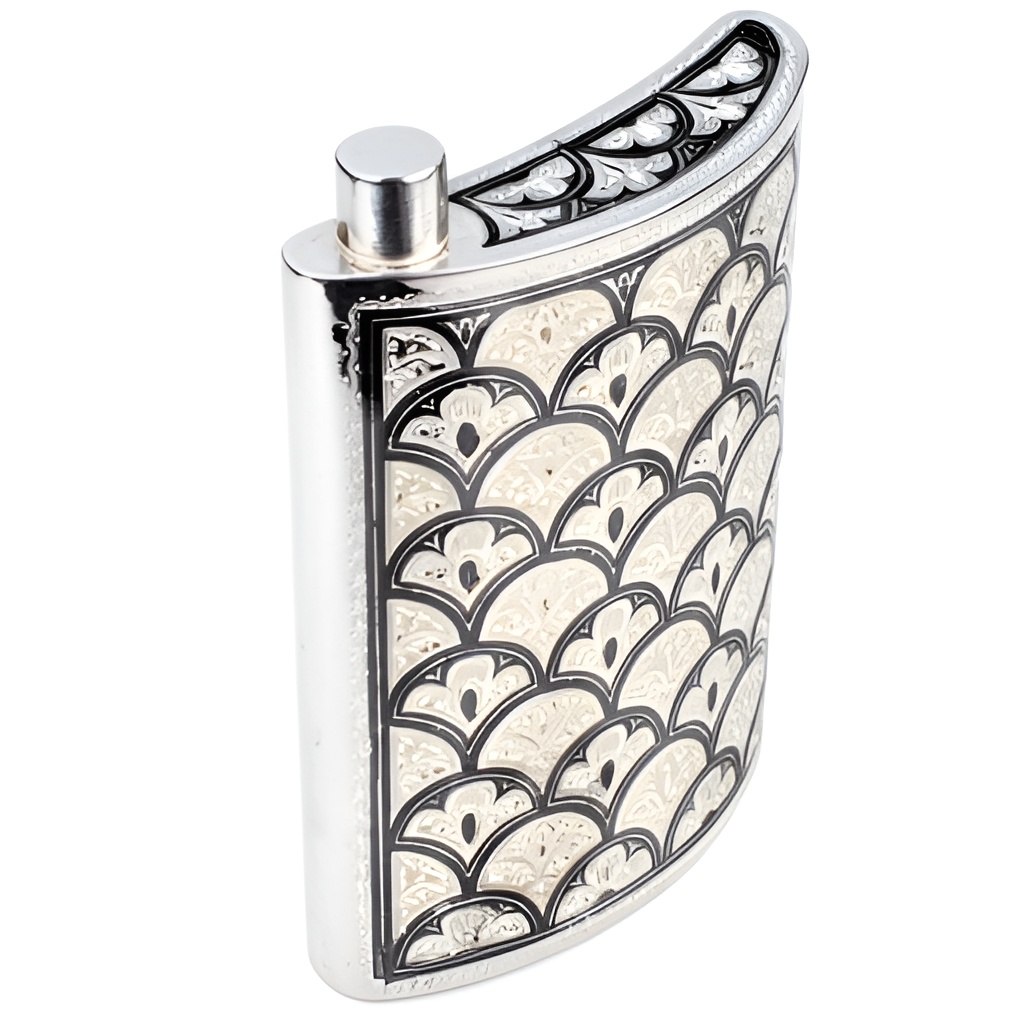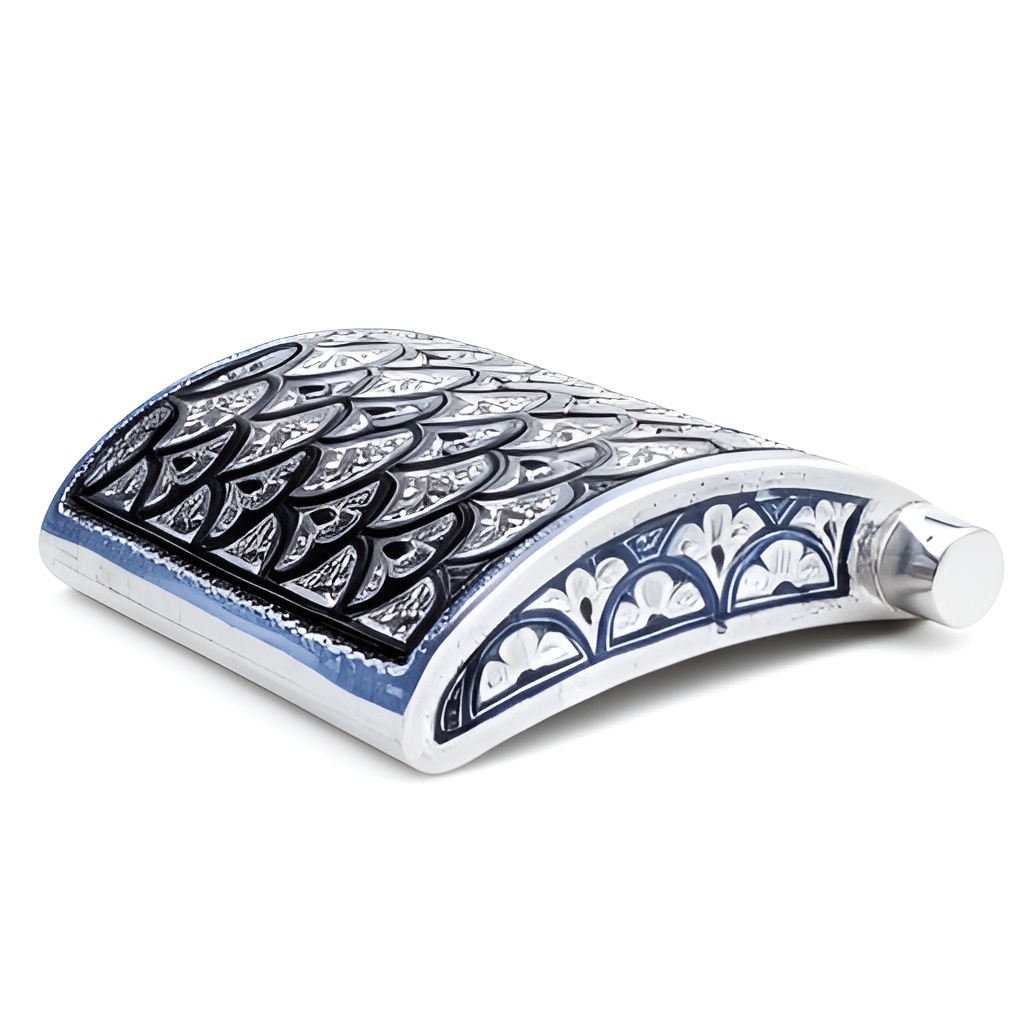 Модель сочетает функциональность походной фляжки и статус дорогого подарка из кубачинского серебра.