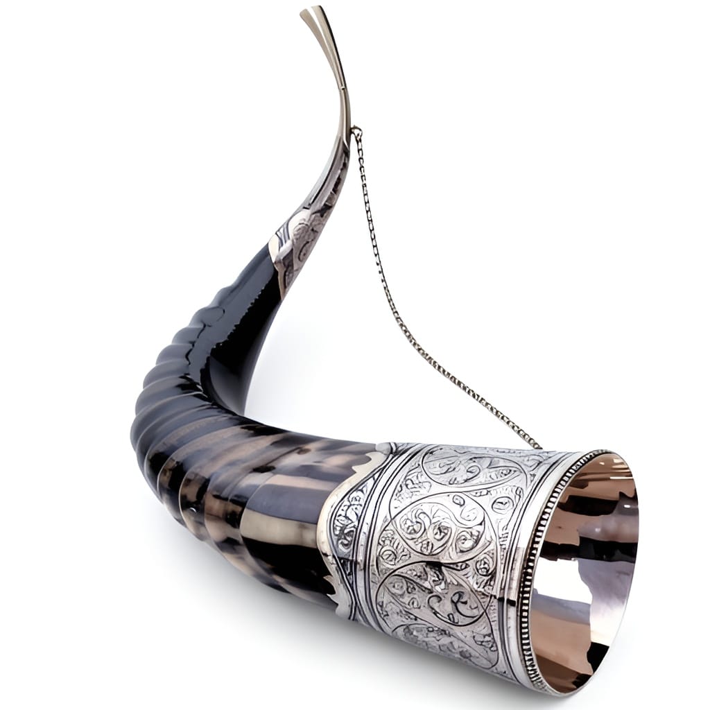 Основание и край рога украшены серебряными накладками 875 пробы с гравировкой и чернёным орнаментом, что делает изделие ярким акцентом любого праздничного стола.