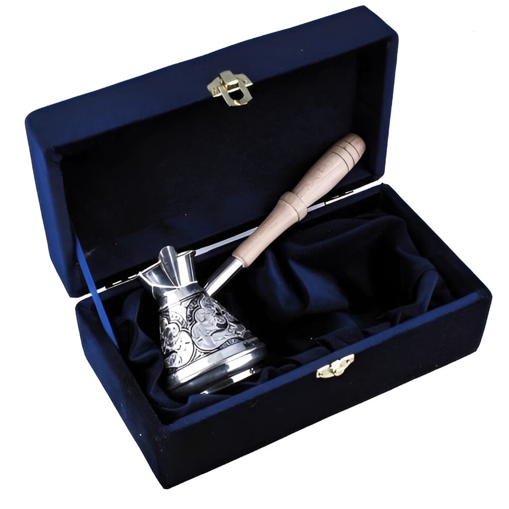 Возможность дополнить изделие бархатным футляром делает турку полностью готовой к вручению как изысканный серебряный презент.