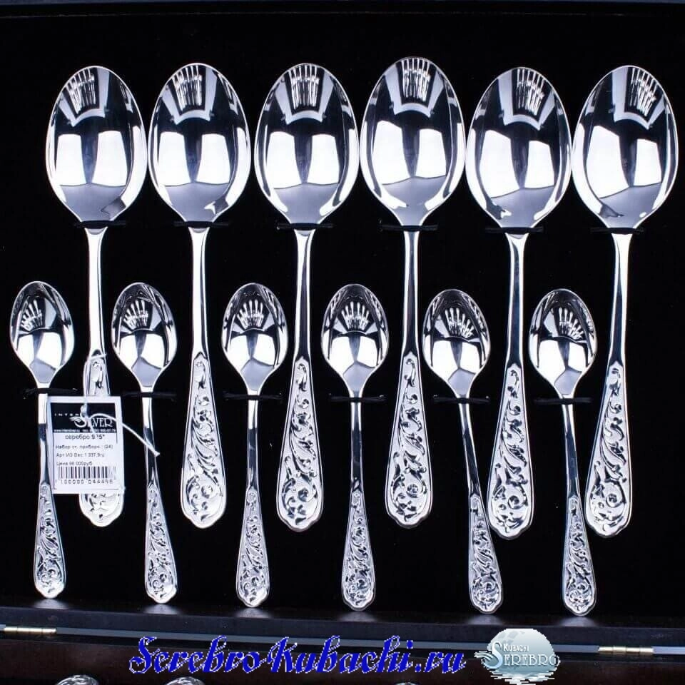 В комплект входят 6 чайных серебряных ложек, 6 столовых ложек и по 6 вилок и ножей из серебра 925 пробы.